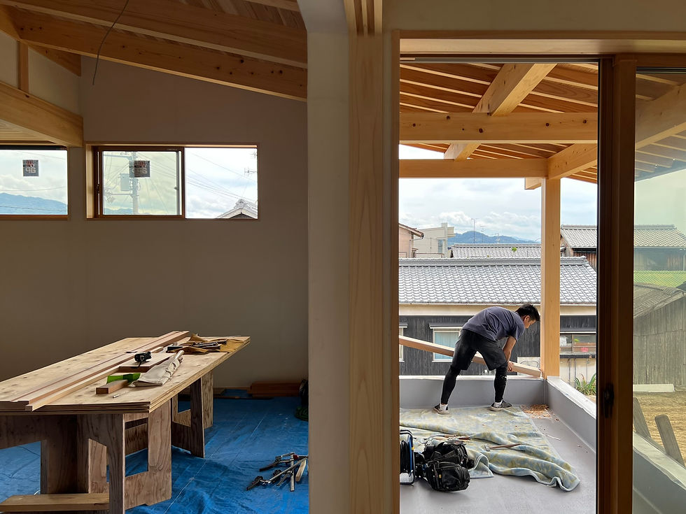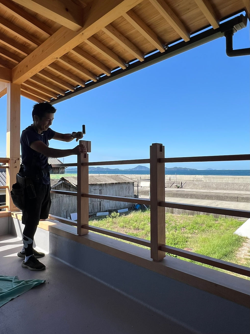 2階のベランダでは、大工さんによって手すりの取付けが始まりました。