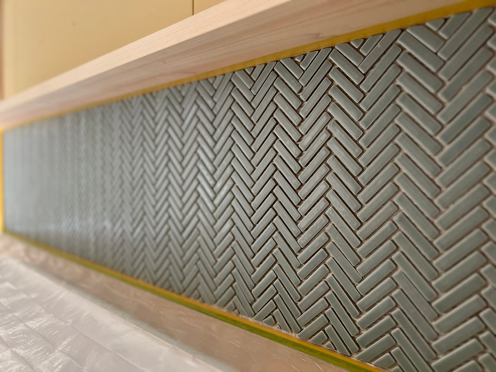 こちらは洗面台の壁のタイル。ヘリンボーン貼り。